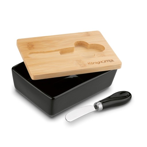 Posiada innowacyjną bambusową pokrywkę, w której umieszczony jest nóż do smarowania.