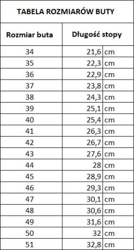 * Tabela jest poglądowa, nie może stanowić podstawy do reklamacji produktu.
