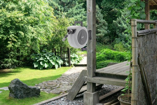Dzięki wspornikowi montażowemu i śrubom możliwe jest przymocowanie zwijacza do ściany. Obrotowy uchwyt ścienny umożliwia obrót od 0-180 stopni nie ograniczając nas w dostępie do podlewania roślin. Do kompletu dołączone są kołki rozporowe z wkrętem