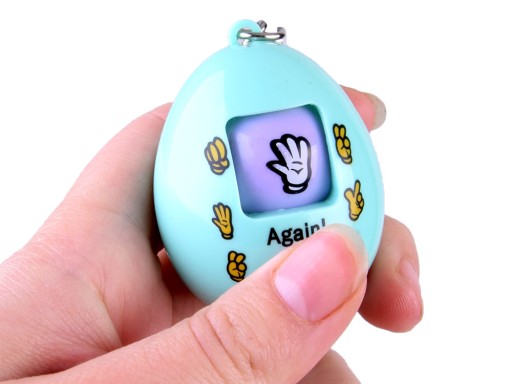Kolorowy breloczek w kształcie jajka z grą świetnie sprawdzi się przy plecaku szkolnym, torebce. Breloczek ma wbudowana popularną grę "kamień, papier, nożyce" wystarczy nacisnąć przycisk, a wirująca łapka pokaże nam dany znak. Fajny gadżet sprawdzi się podczas czekania na autobus, czy podjęcia zakładu z kumplem.Jajko na łańcuszku ma koluszko do zapięcia i karabińczyk.