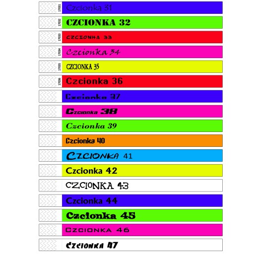 Po dokonanym zakupie w wiadomości dla sprzedającego proszę o napisanie jaki kolor opasek mamy do Państwa wysłać, podanie treści nadruku, numeru czcionki (przykładowe czcionki podane są poniżej i jest ich 47 rodzajów) oraz ewentualny kolor nadruku lub prosimy o przesłanie gotowego pliku graficznego na maila.