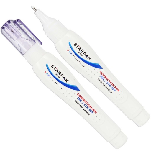Korektor w piórze to niezastąpione narzędzie do precyzyjnego korygowania błędów w tekście. Nasz korektor charakteryzuje się wysoką jakością wykonania oraz funkcjonalnością. Dzięki metalowej, cienkiej, okrągłej końcówce, możesz dokładnie skorygować każdy błąd na papierze. Korektor ma pojemność 7 ml, co zapewnia długotrwałe użytkowanie. Wygodna i ergonomiczna forma korektora pozwala na pewne i precyzyjne prowadzenie ręki, co sprawia, że korekta staje się szybka i efektywna. Biały kolor korektora doskonale ukrywa wszelkie poprawki na papierze, zapewniając estetyczny wygląd sposobu korekty. Korektor w piórze z zatyczką. Metalowa końcówka pisząca zapewnia precyzyjne nakładanie płynu. Miękka, wyprofilowana obudowa umożliwiająca łatwą aplikację płynu korekcyjnego. Szybko schnący płyn korekcyjny, doskonałe właściwości kryjące.