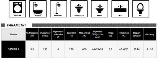 Pompa SANIBO 5 jako jedyne markowe urządzenie dostępne na rynku wyposażona została w obudowę silnika, kosz i rozdrabniacz ze stali nierdzewnej dające niezawodności, a wysokiej mocy silnik pompy posiada wbudowane zabezpieczenie termiczne.
