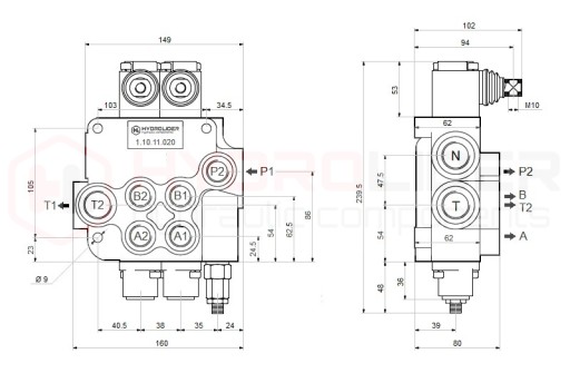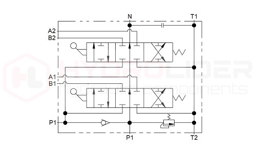 Przystosowany do sterowania cylindrem jednostronnym lub dwustronnym. Posiada wyjście ciśnieniowe N potrzebne do połączeń szeregowych lub do zamontowania rozdzielacza jako kolejny w istniejącym już układzie.
