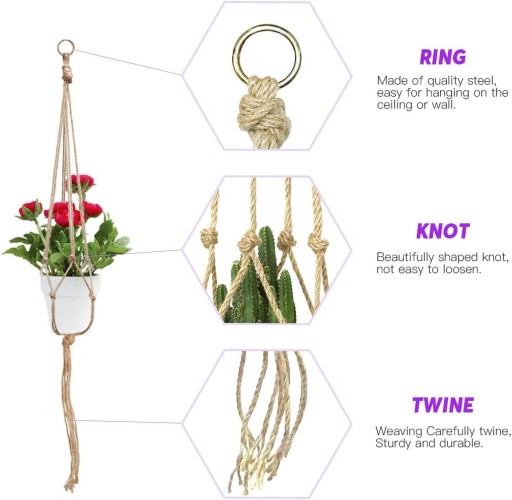 - Ręcznie wykonana lina ------ Wieszaki na rośliny są wykonane z wytrzymałej i trwałej naturalnej juty, z wydrążonym designem, są zakontraktowane i modne, pasują do każdego nowoczesnego lub konwencjonalnego stylu; możesz powiesić je na zewnątrz na kilka dni, aby zapach juty wydobył.