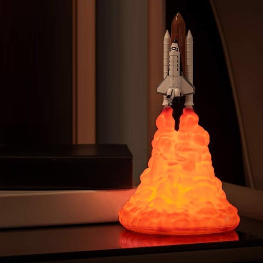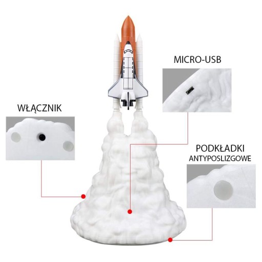 Lampka nocna w kształcie startującej rakiety to niezbędny dodatek każdego pokoju dziecięcego, który z pewnością zachwyci każdego malucha. Źródło światła ulokowane jest w wewnątrz chmury. Lampka świeci bardzo delikatnym czerwonym światłem, przy którym zapanuje bardzo miła i sprzyjająca atmosfera do zasypiania. Lampka nie będzie raziła dziecka po oczach. Produkt wykonany jest ze sztucznego tworzywa, bardzo trwałego oraz odpornego na stłuczenie, czy też uszkodzenie. Unikalna lampka to fantastyczny produkt na prezent z wielu okazji.