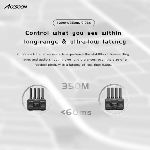 Zyskaj kontrolę nad tym, co widzisz na dużej odległości i przy minimalnym opóźnieniu. CineView HE umożliwia płynne przesyłanie obrazu i dźwięku na duże odległości, nawet na rozmiar boiska piłkarskiego, przy opóźnieniu poniżej 0,06 sekundy.