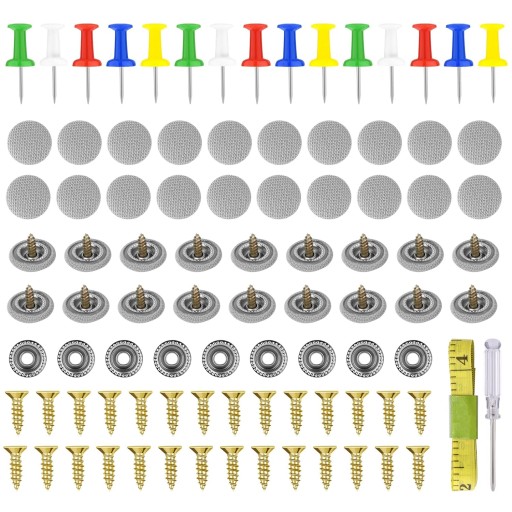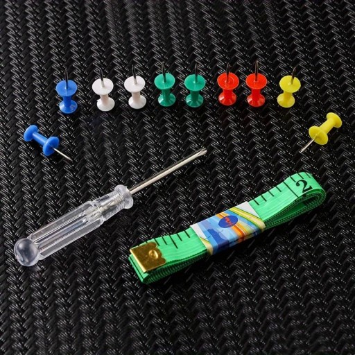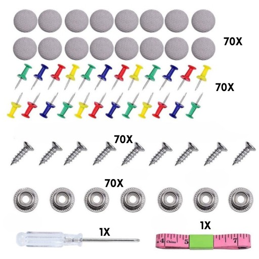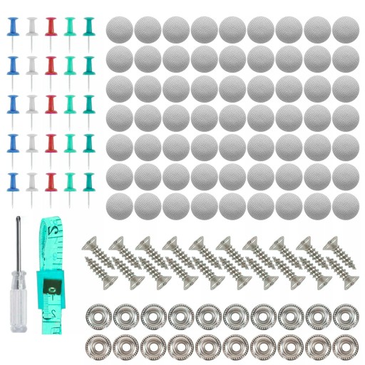 - Kompletny Zestaw: 70 szarych nitów, 70 kolorowych pinezek, śrubokręt i centymetr.
