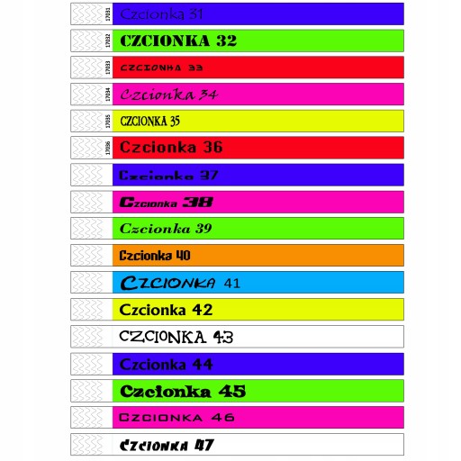 Po dokonanym zakupie w wiadomości dla sprzedającego proszę o napisanie jaki kolor opasek mamy do Państwa wysłać oraz podanie treści nadruku i numeru czcionki (przykładowe czcionki podane są poniżej i jest ich 47 rodzajów).