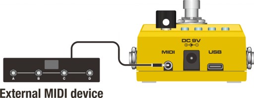 Prawie każdy parametr Loop Core Stereo może być kontrolowany za pomocą zewnętrznego kontrolera MIDI – takiego jak tempo (tap tempo), stop/start/nagrywanie i wiele więcej. Dołączony jest kabel MIDI do 1/8”, dzięki któremu szybko możesz rozpocząć korzystanie z tej funkcji.