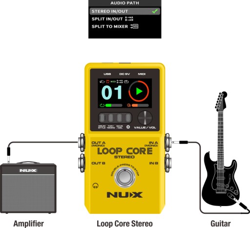 To jest najbardziej powszechna konfiguracja pętli dla gitarzystów. Podłącz gitarę do wejścia A/Mono na pętli Loop Core Stereo i połącz wyjście A/Mono bezpośrednio z wzmacniaczem gitary. Na koniec, ustaw ścieżkę dźwiękową (AUDIO PATH) jak pokazano poniżej.