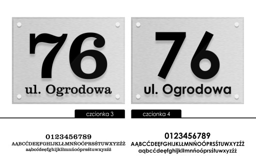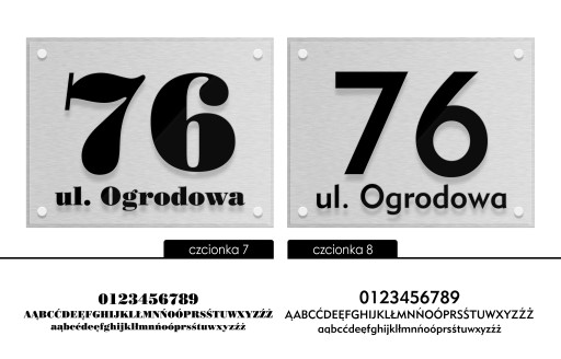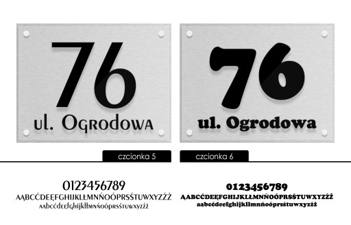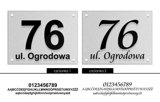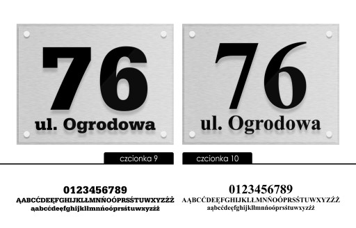 Proponujemy 10 estetycznych i bardzo czytelnych czcionek. Wszystkie posiadają polskie znaki. Dlaczego 10 a nie 50? Ponieważ mamy duże doświadczenie w realizacji tablic adresowych, wiele czcionek kompletnie nie nadaje się do zapisania adresu dlatego właśnie korzystamy tylko z tych, które uważamy za właściwe.