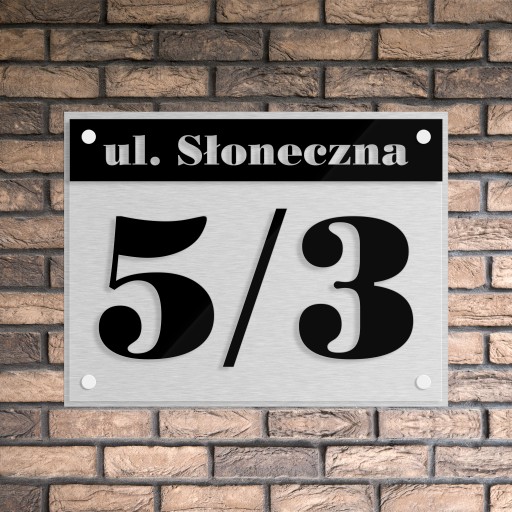 Niezwykle estetyczna, czytelna tablica adresowa w uniwersalnym wymiarze 33cm x 25cm. Tablica w pełni wykonana z materiałów odpornych na warunki atmosferyczne. Przemyślane proporcje tablicy sprawiają, iż zarówno adresy z dużą jak i małą ilością znaków prezentują się doskonale. Na tablicy umieścimy dowolnie podany numer posesji (wraz literami, symbolami specjalnymi i ukośnikami) oraz nazwę ulicy lub miejscowości.