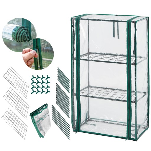 Szklarnia 46 x 24 x 80 cm, folia PVC, metalowa konstrukcja 15-910 NEO to składana, uniwersalna szklarnia, w której z powodzeniem można uprawiać zioła lub niewielkie rośliny owocowe. Charakteryzuje się wymiarami 46 x 24 x 80 cm. Wykonana została z metalowej konstrukcji malowanej proszkowo oraz folii PVC. Jest zamykana na zamek błyskawiczny. Posiada trzy półki oraz otwór frontowy o wymiarach 37 x 70 cm. Szklarnia ma możliwość podwinięcia przedniej ściany w celu nawodnienia lub sprawdzenia roślin. Prosty i szybki montaż ułatwiają jej przenoszenie oraz przechowywanie.