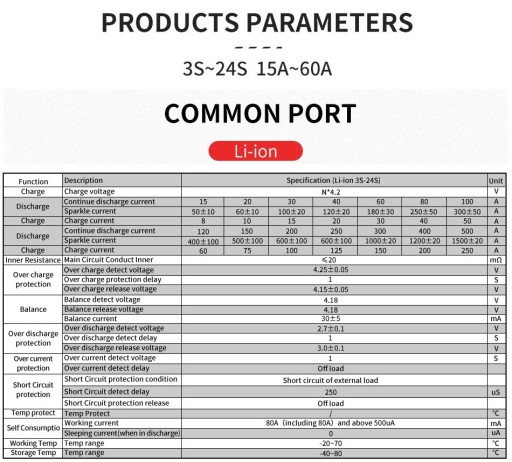 - Czas zadziałania zabezpieczenia nadmiernego przeładowania lub rozładowania: 1 s