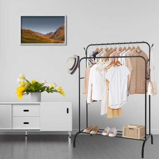 Z dwoma drążkami do wieszania ubrań, dodatkowymi wieszakami na rurkach bocznych oraz dwiema rurkami przy podstawie, które możesz wykorzystać do umieszczenia na nich obuwia, nasz wieszak oferuje wystarczającą przestrzeń do przechowywania ubrań w różnych rozmiarach i długościach. Boczne wieszaki możesz wykorzystać np. do wieszania torebek czy kapelusza, podczas gdy poziome drążki zapewniają miejsce, na którym powiesisz różnego typu ubrania.