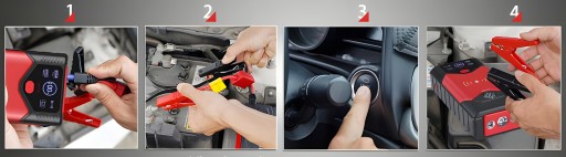 Zacisk został wyposażony w przycisk wspomagania rozruchu, należy go użyć jeśli mamy mocno rozładowany akumulator lub jeśli mamy problem z rozruchem w normalnym trybie pracy boostera i zacisków.