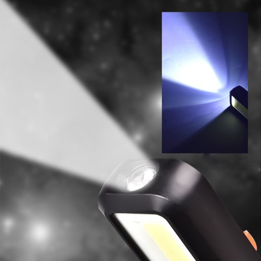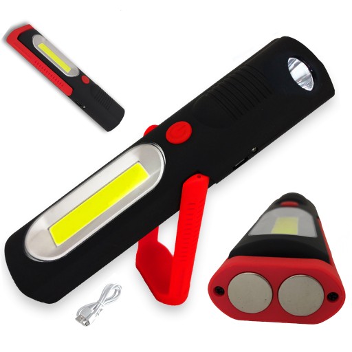 Urządzenie jest wyposażone w diodę COB - główną oraz mocnergo leda 1W. Posiada także przycisk służący do włączania lampy. Możliwość obracania uchwytu. umożliwiają łatwe dostosowanie kierunku oświetlenia. Istnieje również specjalne miejsce do ładowania lampy oraz podwójny magnes, który zapewnia mocne przyczepienie do metalowych powierzchni. Ładowanie latarki za pomocą kabla usb.