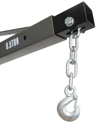 - Podnośnik hydrauliczny wyposażony jest w łańcuch zakończony hakiem. Posiada obrotowy mechanizm umożliwiający łatwe manewrowanie przenoszonym towarem.