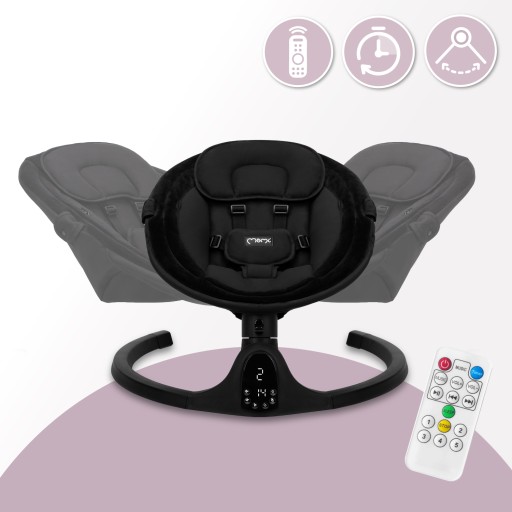 MoMi KENANI ONYX wyposażony jest także w pilota, dzięki czemu możesz z łatwością sterować bujaczkiem bez konieczności podchodzenia do niego. Możesz też ustawiać czas kołysania na 8, 15 lub 30 minut.