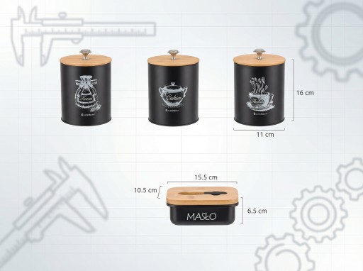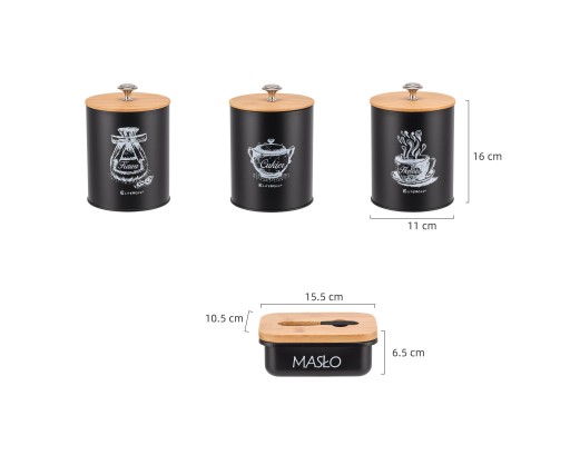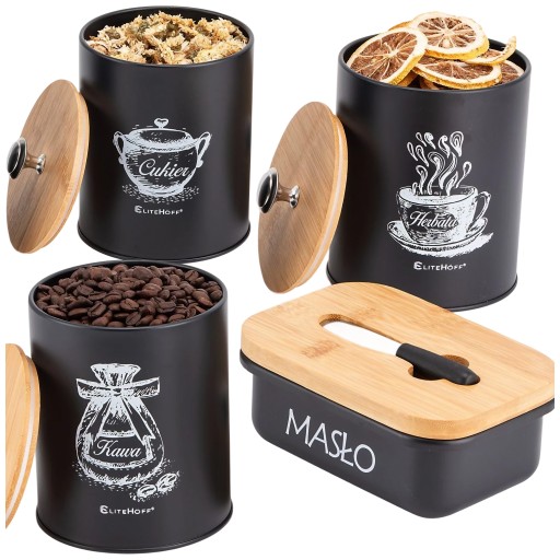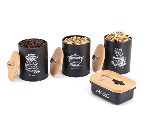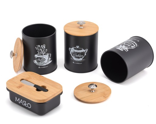 - ➡ The set consists of four containers made of high quality carbon steel painted black and bamboo wood