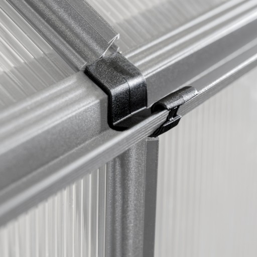 Profil wykonany jest z aluminium i szyb poliwęglanowych – dzięki czemu konstrukcja jest lekka i wytrzymała. W zestawie znajduje się metalowy fundament umożliwiający wbicie w ziemię. Szklarnia wyposażona jest w okna dachowe z regulacją wysokości co sprzyja zachowaniu prawidłowej cyrkulacji powietrza . Ponadto szklarnia posiada podwójne przesuwne drzwi na rolkach oraz rynny odprowadzające wodę.