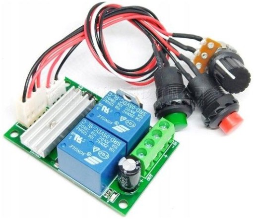 Moduł Regulatora obrotów silnika prądu stałego DC o napięciu pracy od 6V do 24V. Sterowanie odbywa się w technologii impulsowej PWM z niewielką stratą mocy. Regulacji dokonujemy potencjometrem umocowanego na przewodzie o długości około 20 cm. Sterownik posiada przełączniki do zmiany kierunków w prawo (czerwony) lub w lewo (zielony) przyciski te są monostabilne a silnik pracuje tylko podczas wciśnięcia jednego, lub drugiego.