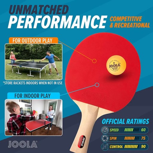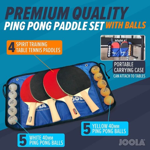 Z zestawem do tenisa stołowego JOOLA FAMILY nic nie stoi na przeszkodzie rodzinnemu meczowi we czwórkę. Zestaw do tenisa stołowego FAMILY składa się z 4 rakietek do tenisa stołowego JOOLA SPIRIT i 5 piłek do tenisa stołowego, każda w kolorze białym i pomarańczowym. W praktycznej i poręcznej torbie wszystkie paletki i piłki znajdą swoje miejsce do przechowywania.