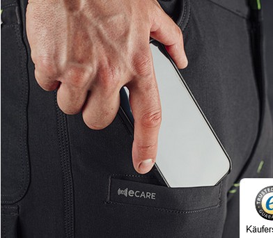 Wzmocnione kieszenie idealnie nadają się do przechowywania mniejszych narzędzi, takich jak mierniki lub inne przybory codziennego użytku. Najlepiej przechowywać telefon komórkowy w specjalnej torbie z technologią E-Care – chroni ona przed niebezpiecznym promieniowaniem.