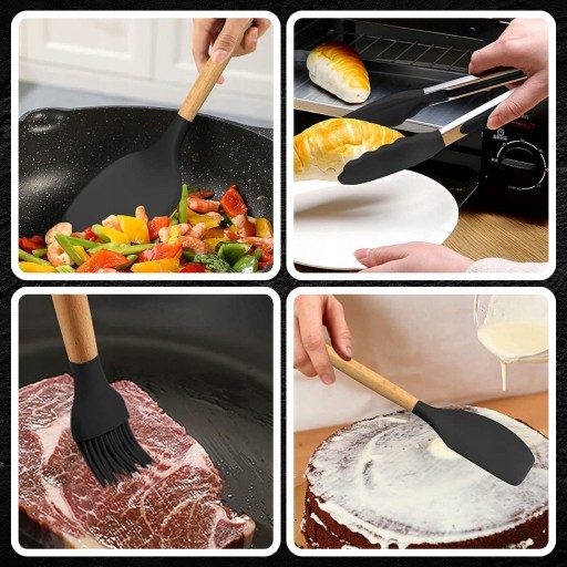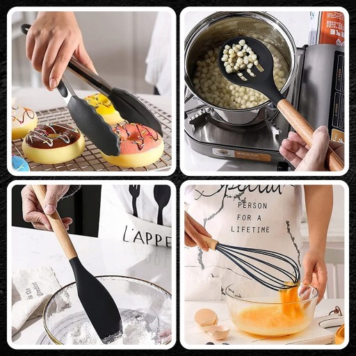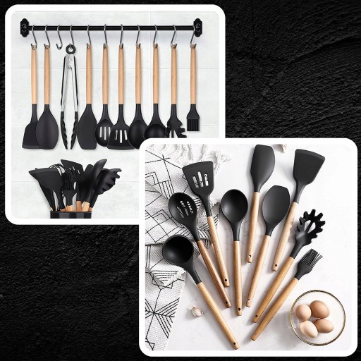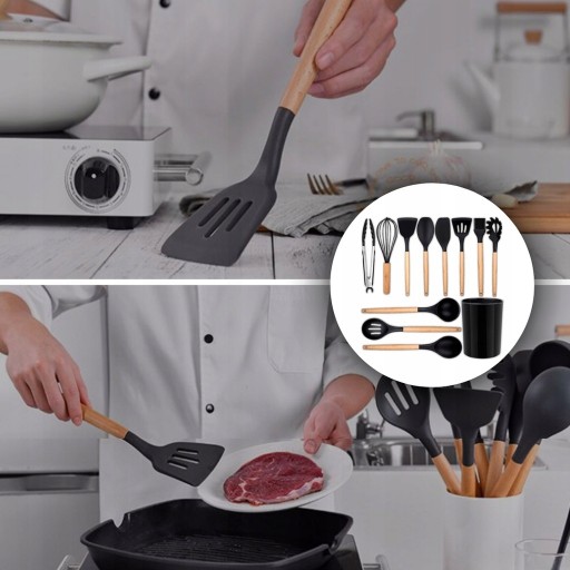 ✅DUŻY ZESTAW – cały zestaw składa się z 12 elementów. 11 przyborów oraz ociekacza / pojemnika. Każde narzędzie służy do czego innego. Są łopatki, chochelki, podbierak do makaronu, trzepaczka, łyżki, szczypce czy pędzel.