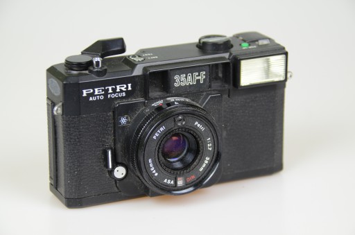 Petri Auto focus 35 AF - F firmy Kuribayashi Camera Works z Japonii. Stan jak na zdjęciach. Aparat kolekcjonerski, nie testowany z baterią lub filmem, nie naprawiany, nie czyszczony. Sprzedaję jako niesprawny.