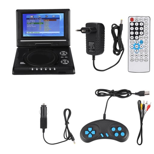 7-calowy przenośny odtwarzacz DVD z obrotowym ekranem Telewizor z możliwością ładowania Ładowarka samochodowa Gamepad 100–240 V, wtyczka UE