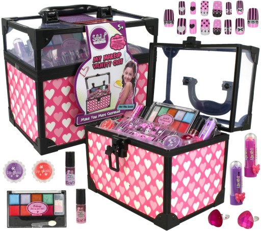 Oferowany zestaw z pewnością ucieszy każda małą damę i pozwoli na wykonanie ciekawych stylizacji. Całość znajduje się w kuferku zamykanym za pomocą klamry. Sam kuferek jest bardzo elegancko i ciekawie wykonany. Górna część jest przeźroczysta, a dolna posiada ciekawą grafikę w serduszka.