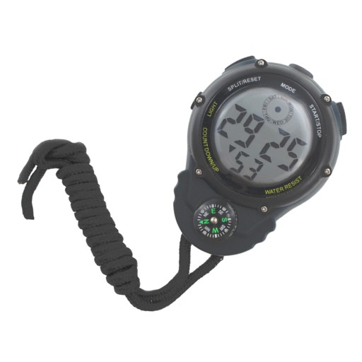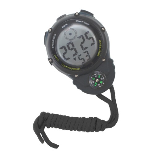 Przenośny cyfrowy stoper ze smyczą, który można zawiesić na torbie lub plecaku albo na nadgarstku lub szyi.