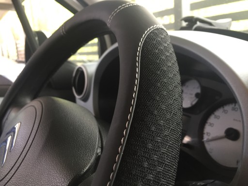 Pokrowiec na kierownicę z wysokiej jakości materiałów (ekoskóra połączona z materiałem antypoślizgowym).