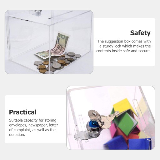 ✅Ta urna wyborcza wykonana jest z przezroczystego akrylu premium, który jest stabilny i trwały. Pudełko na sugestie jest wyposażone w solidny zamek, który sprawia, że zawartość jest bezpieczna. Przejrzyste pole sugestii pozwala łatwo zobaczyć, jaka zawartość się w nim znajduje i jest odpowiednie dla niezależnie od tego, czy organizujesz wydarzenia.