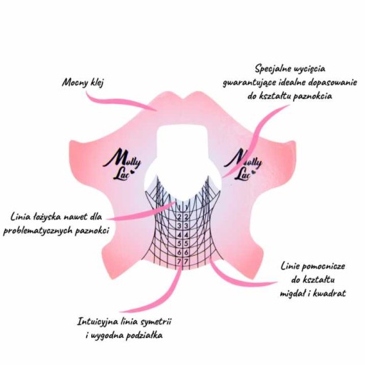 Formy idealnie przylegają do paznokcia, dzięki czemu pozbędziesz się problemu 'podlewania' żelu pod paznokieć co często prowadzi do nadłamań. Idealnie dobrany, mocny klej zapobiega rozklejaniu, ale nie powoduje podrażnień, przez co może być wykorzystany nawet do bardzo wrażliwych dłoni.