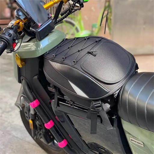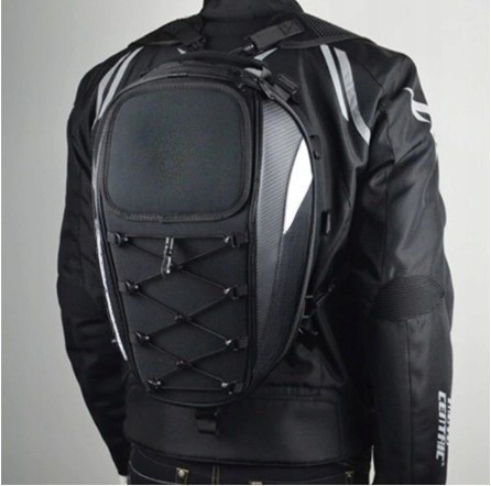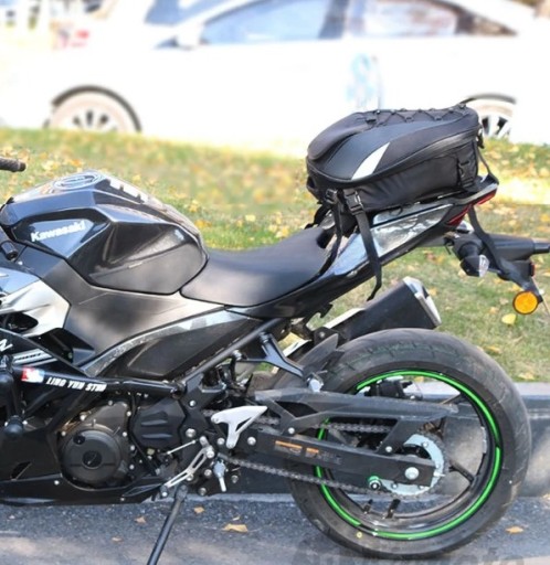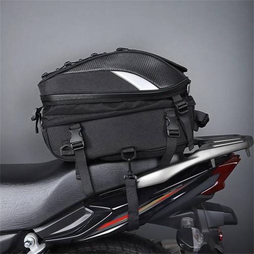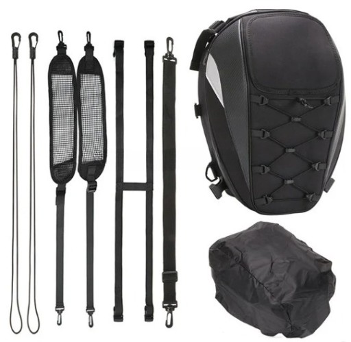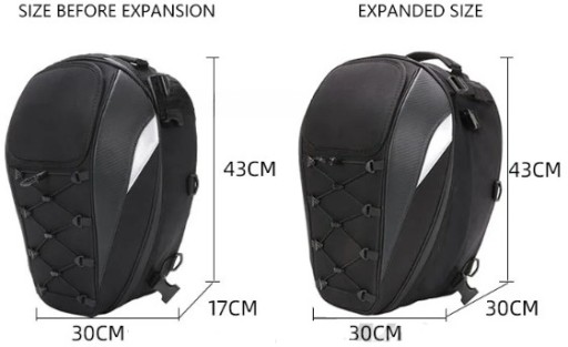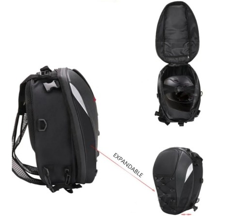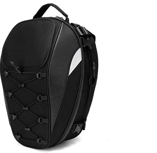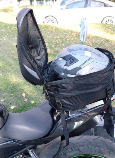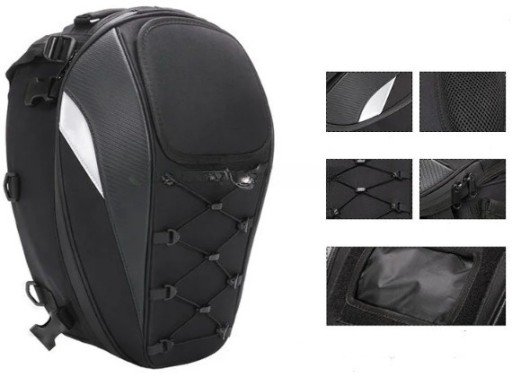 Opis: Jest to bardo uniwersalny plecak który dzięki dzięki licznym paskom w zestawie można zamontować/przymocować do motocykla na tylne siedzenie lub do baku. Posiada możliwość zwiększenia pojemności dzięki czemu spokojnie zmieści kask. Brak logo na plecaku jest celowym zabiegiem dzięki czemu plecak wykłada stylowo i nie rzuca się w oczy. Jednak dzięki odblaskom jest świetnie widoczny w nocy.