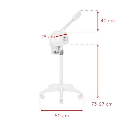 Wapozon wielofunkcyjny z ciepłą parą i ozonem, zamocowany na regulowanym statywie, stanowi niezastąpione narzędzie w każdym salonie kosmetycznym. Działa wielokierunkowo, dezynfekując skórę, otwierając pory, oczyszczając je z nadmiaru sebum oraz resztek kosmetyków, a także wspomagając proces detoksykacji skóry. Dodatkowo, poprawia krążenie krwi, nawilża, odświeża oraz przywraca naturalną kwasowość skóry, co przekłada się na lepsze efekty zabiegów kosmetycznych. Moc urządzenia wynosi 800 W. W zestawie znajduje się urządzenie z dyszą, regulowany statyw, pięcioramienna podstawa na gumowych kółkach, instrukcja obsługi oraz gwarancja. Opakowanie ma wymiary 70 x 18 x 28 cm.
