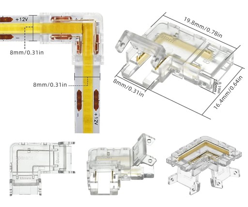 Złączka kątowa do taśm COB LED 8mm łącznik 90° zacisk szybki montaż klikana
