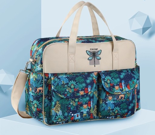 - Torbę można nosić w rękach za pomocą dwóch uchwytów lub na ramieniu oraz można powiesić na ramię wózka ( pasek na ramię w zestawie),