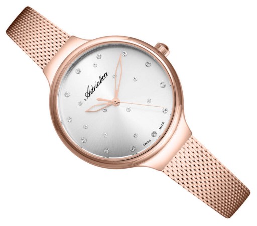 Damski biżuteryjny mały zegarek Adriatica A3723.9143Q. Stalowa koperta i bransoleta (siatkowa) pokryte odporną na ścieranie powłoką w kolorze różowego złota. Srebrna tarcza wysadzana cyrkoniami. Klasa szczelności WR. Szwajcarski mechanizm kwarcowy