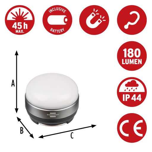 Lampka zewnętrzna LED firmy BRENNENSTUHL. Zasilana trzema bateriami AAA jest w stanie świecić do 45h.