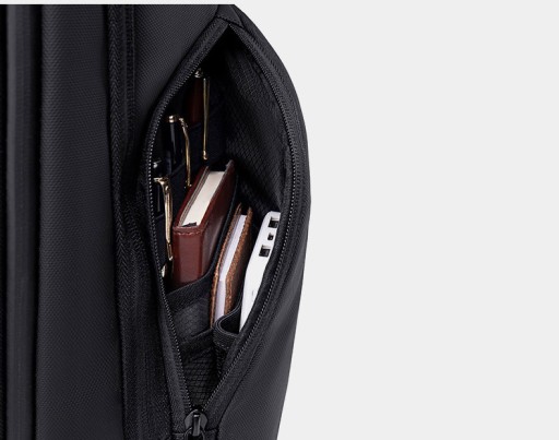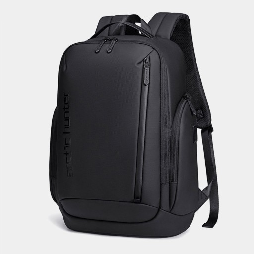 Jednokomorowy plecak na laptopa marki Arctic Hunter o symbolu B00554 został wykonany z wodoodpornych materiałów – PVC i oxford. Wewnątrz głównej komory znajduje się organizer na akcesoria i długopisy, przypinka na klucze oraz miękka kieszeń na laptopa w rozmiarze do 15,6" z elastycznym paskiem do przytrzymania urządzenia. Po bokach plecaka umieszczono kieszenie na podręczne rzeczy: z prawej wodoodporną kieszeń na parasolkę lub kosmetyki, a z lewej kieszeń z dwoma kieszonkami na drobiazgi i elastycznym paskiem do ich przytrzymania. Z lewej strony plecak posiada również zewnętrzne gniazdo USB, dzięki czemu nie ma konieczności wyciągania power banka z plecaka, aby naładować telefon lub inne przenośne urządzenie. Z przodu plecaka umieszczono szeroką kieszeń z wodoodpornym zamkiem na podręczne rzeczy. Tył plecaka i szelki są wyłożone miękkimi, oddychającymi gąbkami, aby plecak był wygodny podczas noszenia. Szelki o ergonomicznym kształcie posiadają możliwość regulacji w miejscu połączenia z solidnymi, nylonowymi paskami. Ponadto na jednej szelce umieszczono kieszonkę na kartę lub identyfikator, a na drugiej dedykowany zaczep na okulary. Na tylnej ścianie umieszczono również szeroki pas, dzięki któremu można założyć plecak na rączkę torby lotniczej. Plecak posiada uchwyt do wygodnego przenoszenia go w ręce oraz wieszak do zawieszenia go na wieszaku.