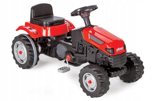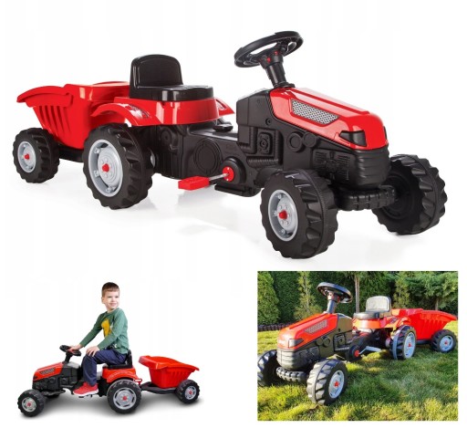 Traktor napędzany jest za pośrednictwem pedałów które stabilnie zamocowane są w konstrukcji nośnej zabawki. Bardzo ciekawą funkcją jest możliwość regulacji siedzenia w zakresie przód – tył, umożliwia odpowiednie przygotowanie pojazdu do wysokości dziecka. Dodatkowo na wyposażeniu znajduje się duża przyczepka w której można przewozić zabawki, wiaderka, łopatki czy też piasek i kamienie.