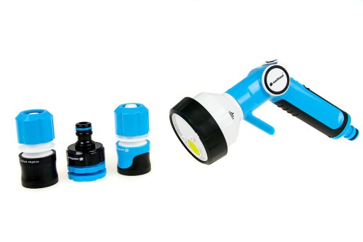 Zestaw z wysokiej jakości zraszaczem pistoletowym. W zestawie przyłącze do wkręcenia w ujęcie wody.