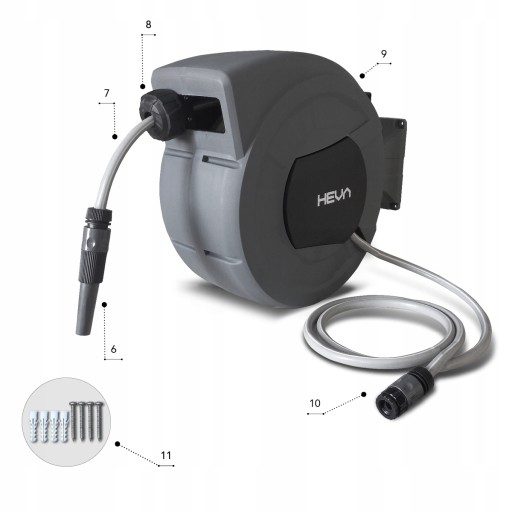 Kupując zwijacz HEVA wszystkie potrzebne elementy otrzymasz w zestawie, dzięki czemu pracę możesz rozpocząć od razu. W zestawie prócz końcówek takich jak dysza spryskującą i pistolet, znajduje się również przyłącze do kranu, złączki oraz wąż przyłączeniowy o długości 1,5m.
