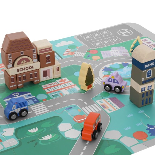 Zestaw drewnianych klocków to doskonały prezent dla każdego dziecka niezależnie od jego wieku czy płci. Z jego pomocą zbudujecie własne miasto. Ogranicza Was jedynie wyobraźnia. W skład zestawu wchodzą samochodziki, znaki, drzewka oraz budynki. Na klockach znajdują się także cyferki i literki, które pozwolą połączyć zabawę i naukę.