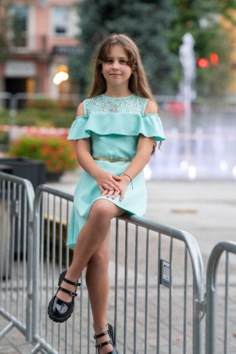 Delikatny, świetnie się układający materiał w uroczym miętowym kolorze. Odkryte ramiona podkreślone falbanką nadają sukience niepowtarzalny charakter. Elegancji sukience dodaje użyta koronka i złoty pasek w talii.