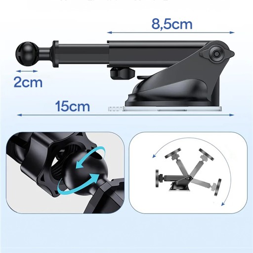 ⭐ Prosty montaż - Dzięki wytrzymałemu ramieniu i silnej przyssawce, łatwo i szybko zamontujesz uchwyt w wybranym miejscu! Bez potrzeby dodatkowych narzędzi! 🛠️